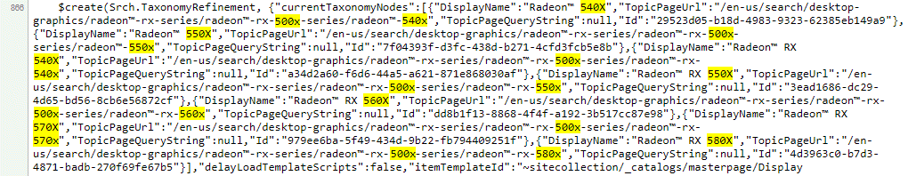 AMD Radeon RX 540X, 550X, 560X, 570X & 580X (im Quelltext von AMDs Webseite)