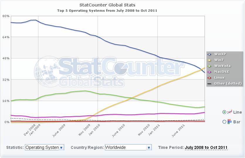 Betriebssystem-Verbreitung weltweit Juli 2008 bis Oktober 2011