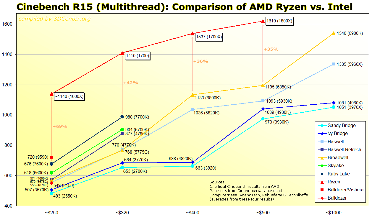 Cinebench R15 Multithread: Comparison AMD Ryzen vs. Intel