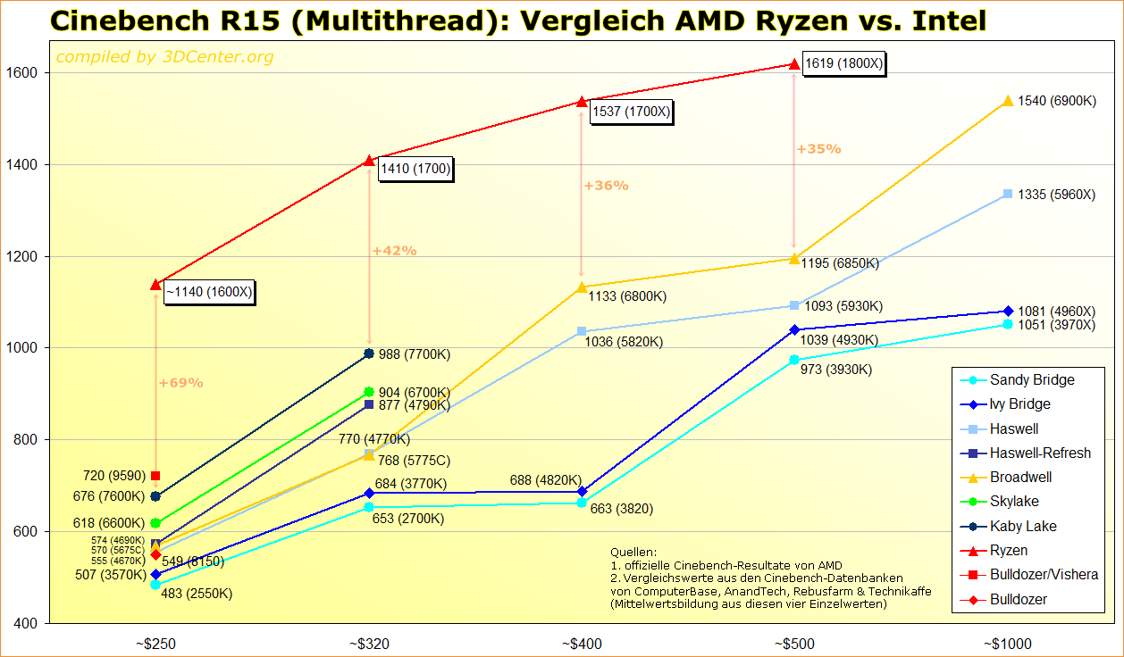 Cinebench R15 Multithread: Vergleich AMD Ryzen vs. Intel