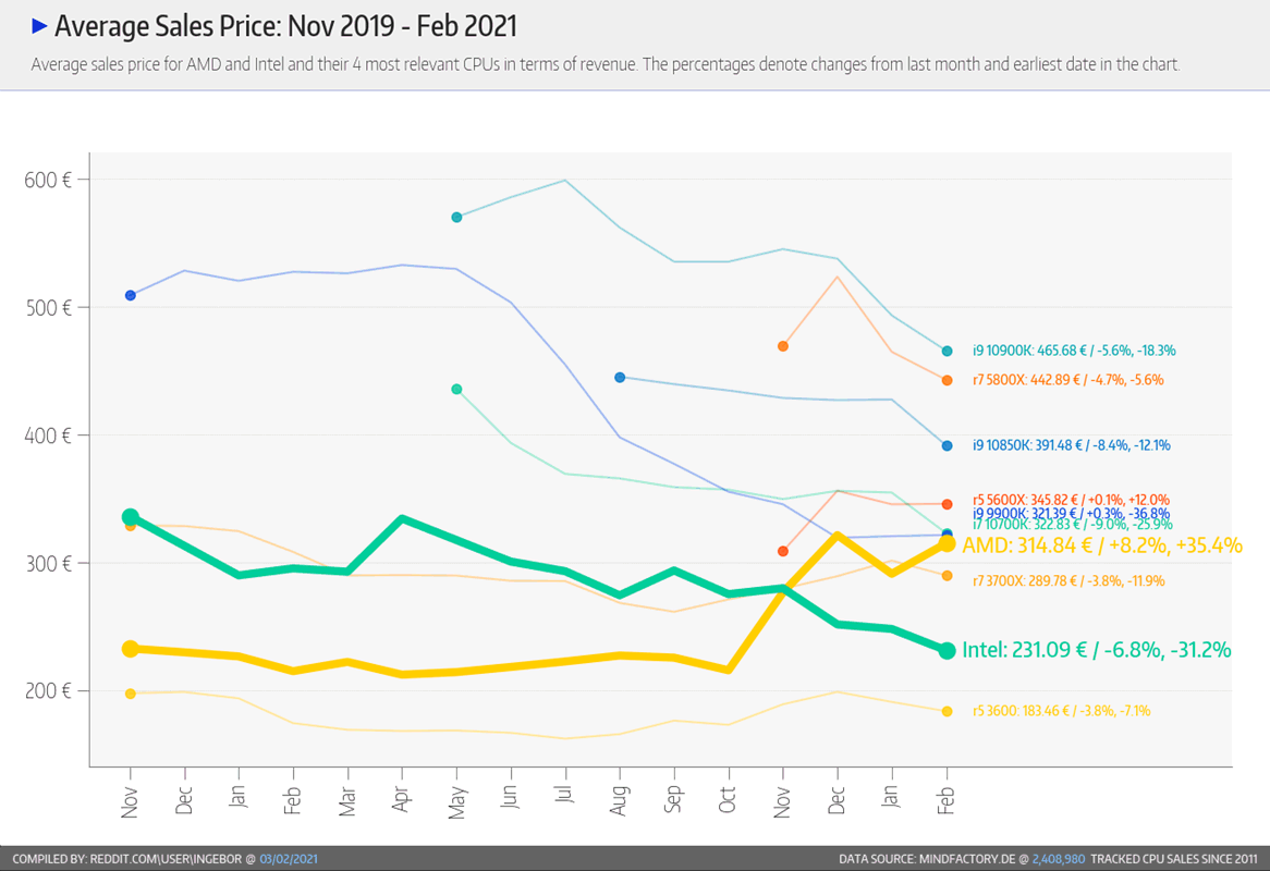 CPU-Verkäufe Mindfactory 2021: Durchschnittliche Verkaufspreise (by Ingebor)