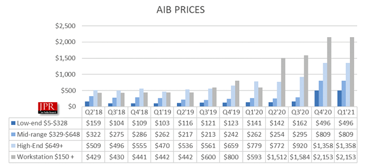 Desktop-Grafikkarten durchschnittliche Verkaufspreise 2018-2021 (by JPR)