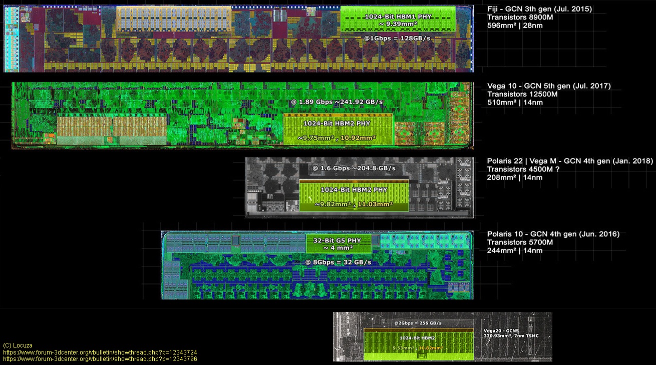 Flächenbedarf von GDDR5-, GDDR6-, HBM1- & HBM2-Speicherinterfaces