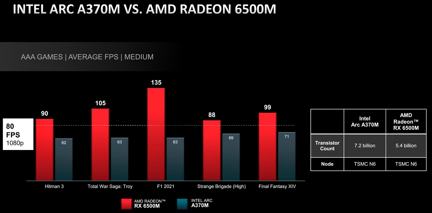 Intel Arc A370M vs. AMD Radeon RX 6500M (AMD-eigene Benchmarks)