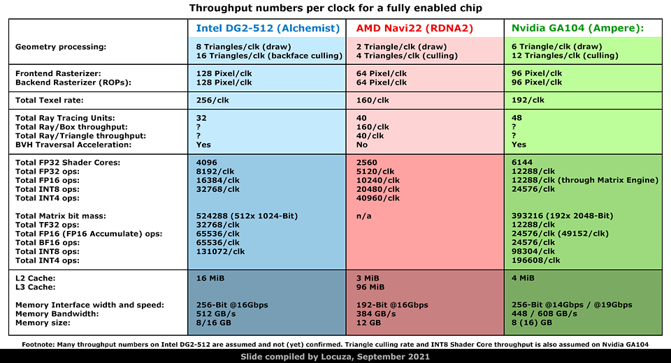 Intel DG2-512 vs AMD Navi 22 vs nVidia GA104 Chipdaten (by Locuza)