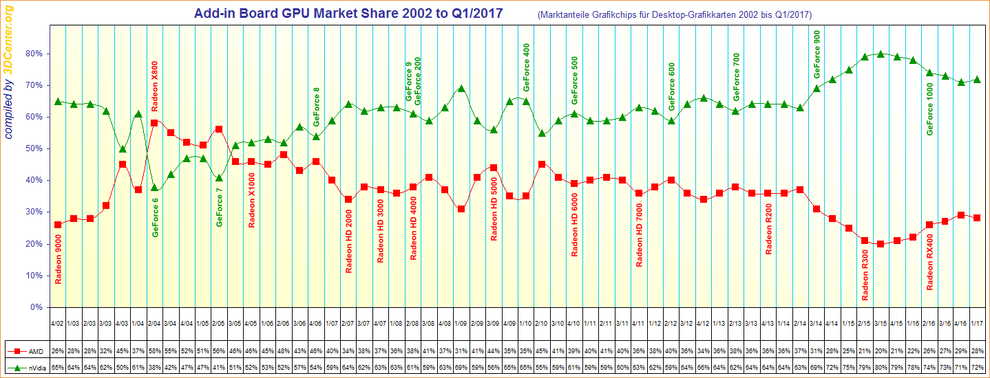 Marktanteile Grafikchips für Desktop-Grafikkarten von 2002 bis Q1/2017