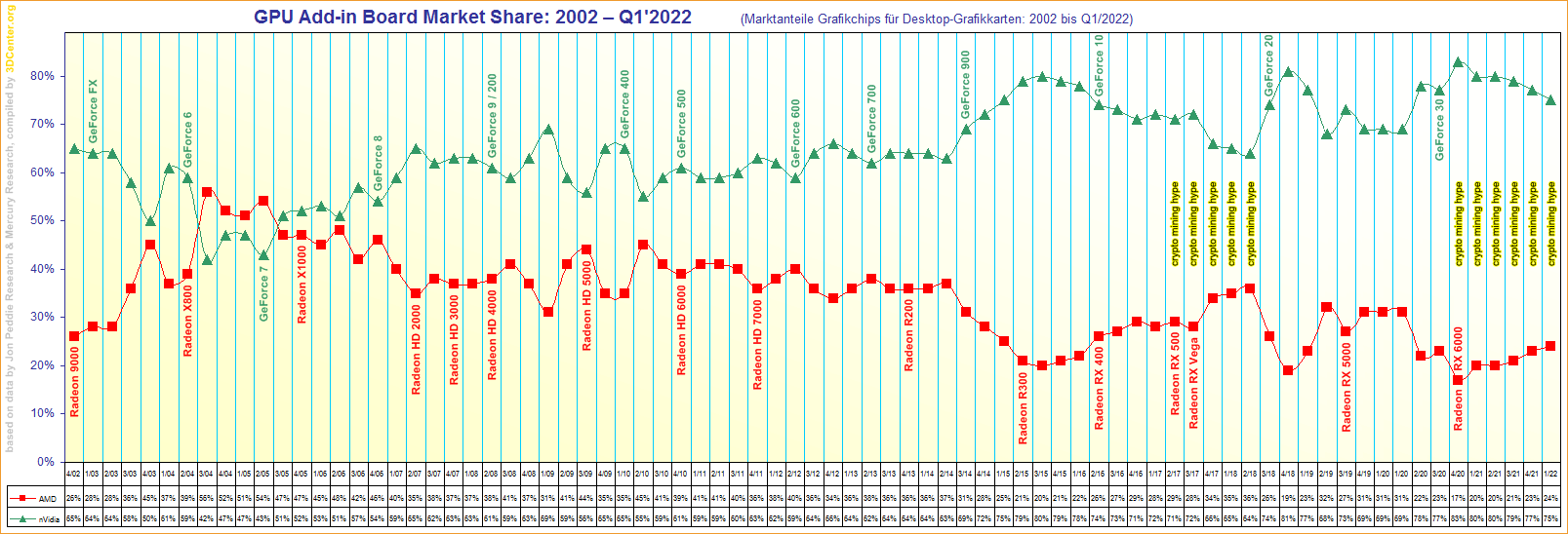 Marktanteile Grafikchips für Desktop-Grafikkarten von 2002 bis Q1/2022