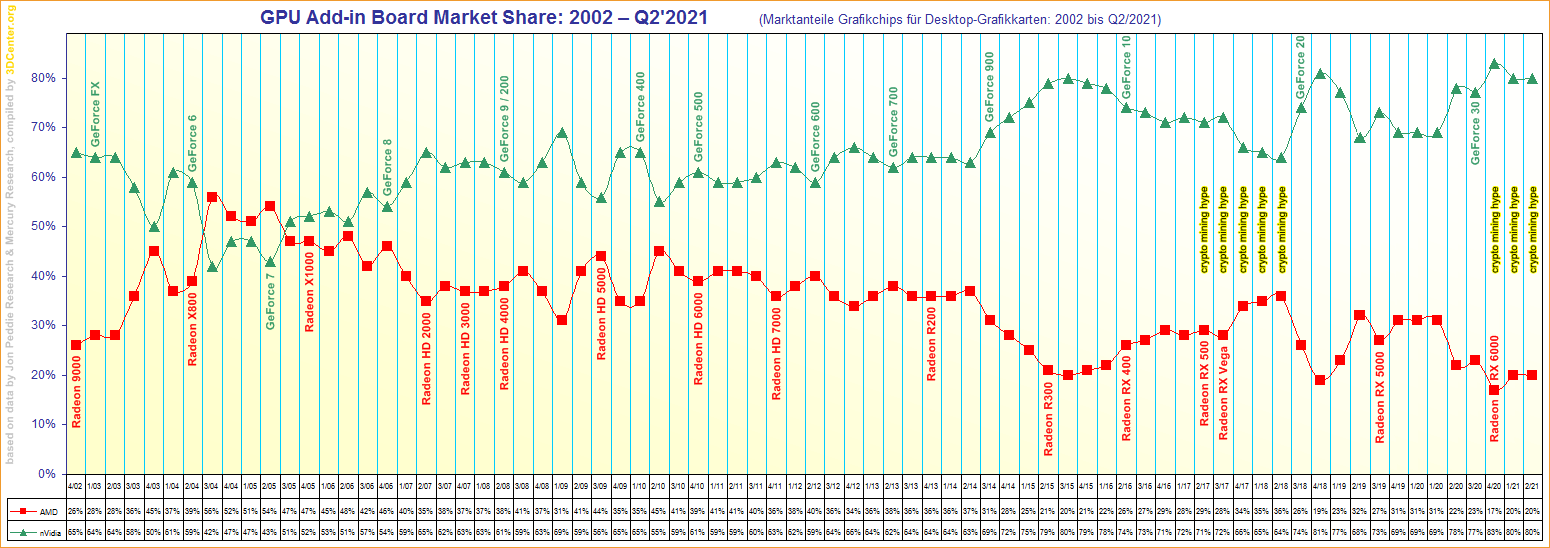 Marktanteile Grafikchips für Desktop-Grafikkarten von 2002 bis Q2/2021