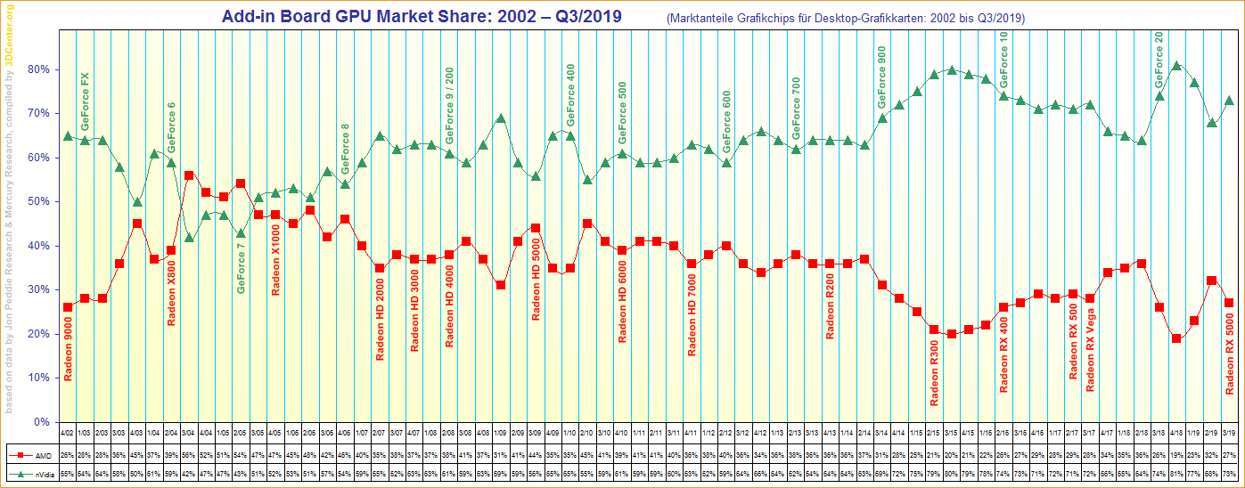Marktanteile Grafikchips für Desktop-Grafikkarten von 2002 bis Q3/2019
