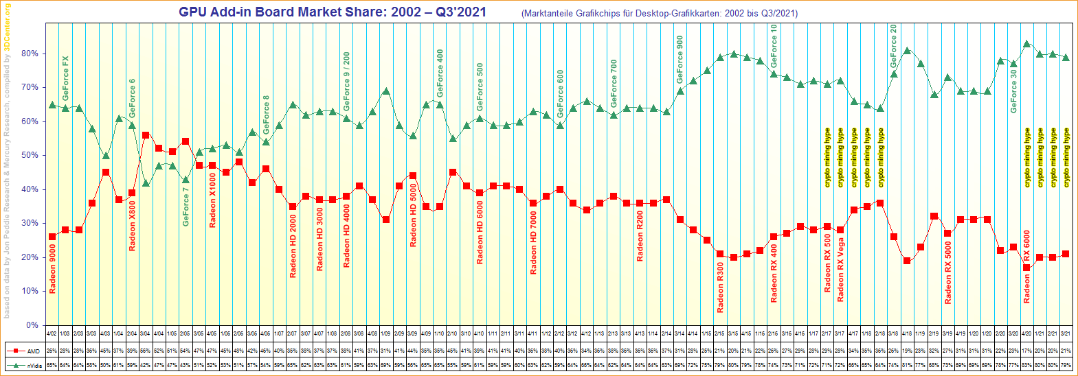 Marktanteile Grafikchips für Desktop-Grafikkarten von 2002 bis Q3/2021