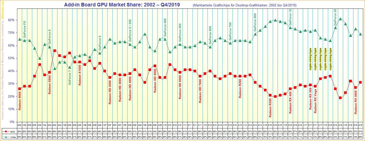 Marktanteile Grafikchips für Desktop-Grafikkarten von 2002 bis Q4/2019