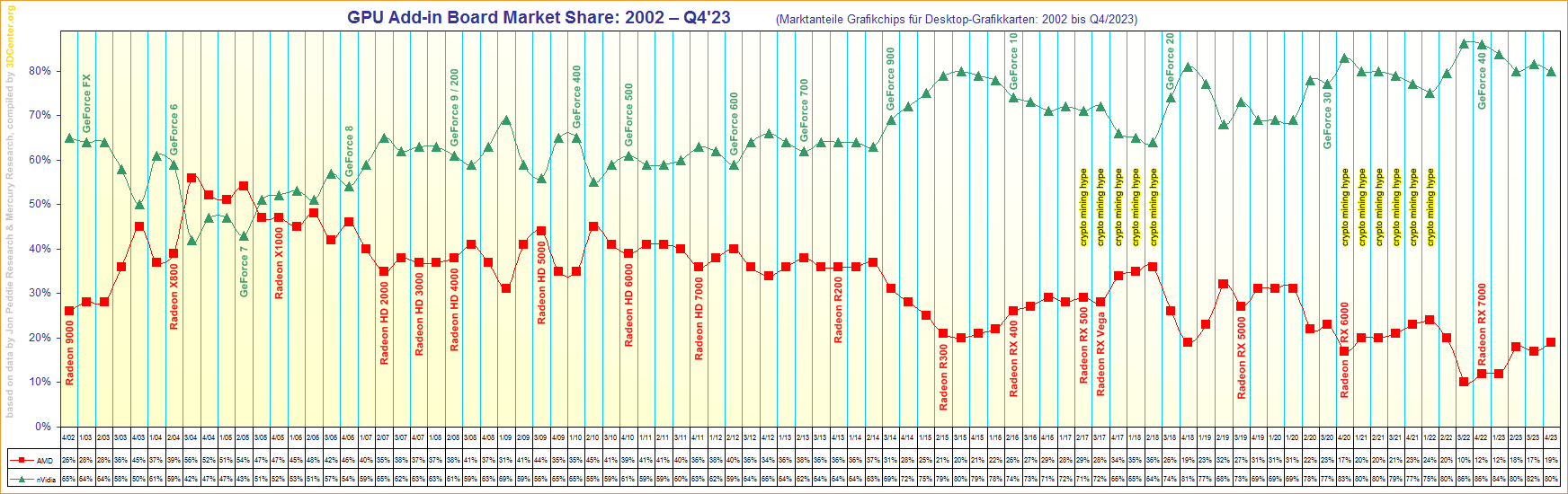 Marktanteile Grafikchips für Desktop-Grafikkarten von 2002 bis Q4/2023