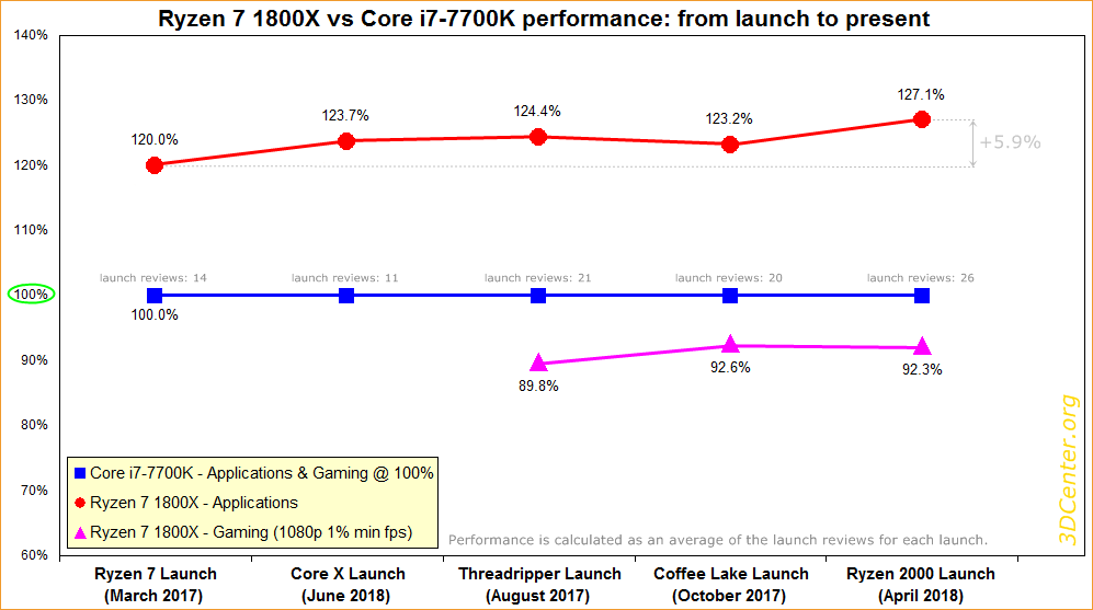 Ryzen 7 1800X vs Core i7-7700K performance: from launch to present