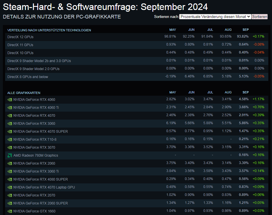 Steam-Statistik der weltweit benutzten Grafikkarten für September 2024