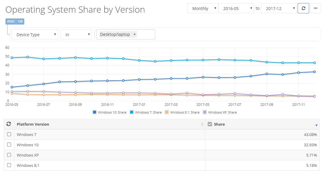 Weltweite Betriebssystem-Verteilung (PC) von Mai 2016 bis Dezember 2017 (lt. NetMarketShare)
