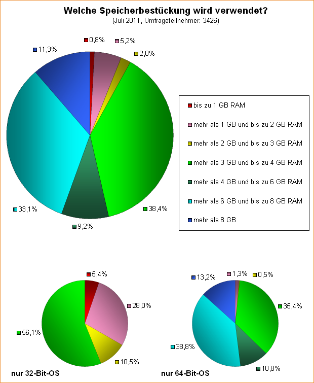Die Umfrage der letzten Woche hatte die aktuelle Speicherbestückung zum Thema, die Wiederholung einer Umfrage vom April 2009 mit erneut sehr interessanten Ergebnissen. Auffallend im Quervergleich ist sofort der große Zug hin zu 64-Bit-Betriebssystemen: Während im April 2009 es zwischen 32- und 64-Bit-Betriebssystemen noch 55:45 zugunsten der 32-Bit-Systeme stand, steht das Verhältnis heuer bei satten 15:85 zugunsten der 64-Bit-Systeme. Die durchschnittliche Speicherbestückung ist dagegen innerhalb dieser etwas mehr als zwei Jahre nur von 4,1 GB auf inzwischen 6,4 GB hochgegangen – dies sieht vielleicht unterdurchschnittlich aus angesichts der früheren Marktweisheit, daß sich die Speicherbestückung jedes Jahr verdoppelt, allerdings ist hier in letzter Zeit eine klare Wachstumsverlangsamung eingetreten. Zwar müssten die wieder einmal sehr niedrigen Speicherpreise eine weitere Aufrüstung eigentlich begünstigen, aber derzeit scheint wohl eher das Problem zu existieren, daß es kaum Anwendungsfälle gibt, wo größere Speichermengen etwas bringen – mit der Aussicht, daß sich dies auch in absehbarer Zukunft nicht ändern wird.