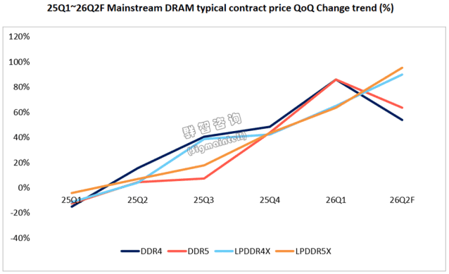 Analyst Jukan @ X berichtet über erneut steigende DRAM-Kontraktpreise im zweiten Quartal – nur diesesmal mit nach unten gehender Trendkurve, sprich die Erhöhung fällt gegenüber dem ersten Quartal deutlich ab. In jenem lag der Anstieg der DRAM-Kontraktpreise bei wohl +70% gegenüber dem Vorquartal, im laufenden zweiten Quartal sollen es nochmals +30-50% werden. Dies ist nicht schön, zeigt aber auch bei den Kontraktpreisen darauf hin, dass die Steigerungen irgendwann in ein Maximum laufen werden. Sehr interessant ist zudem die hierzu präsentierte Infografik seitens der Marktforscher von 'SigmaIntell', welche die Steigerung der Kontraktpreise über die letzten Quartale offenlegt. Hier wird nicht die durchschnittliche Steigerung aller DRAM-Klassen notiert, sondern nach vier Speichersorten unterschieden – womit auch die Steigerung bei DDR4 & DDR5 höher ausfällt als die vorgenannten +70%. Gerade jene sollen nun aber im laufenden zweiten Quartal weit weniger stark im Preis steigen – was wie gesagt darauf hindeutet, dass dann irgendwann das Preismaximum erreicht sein muß.