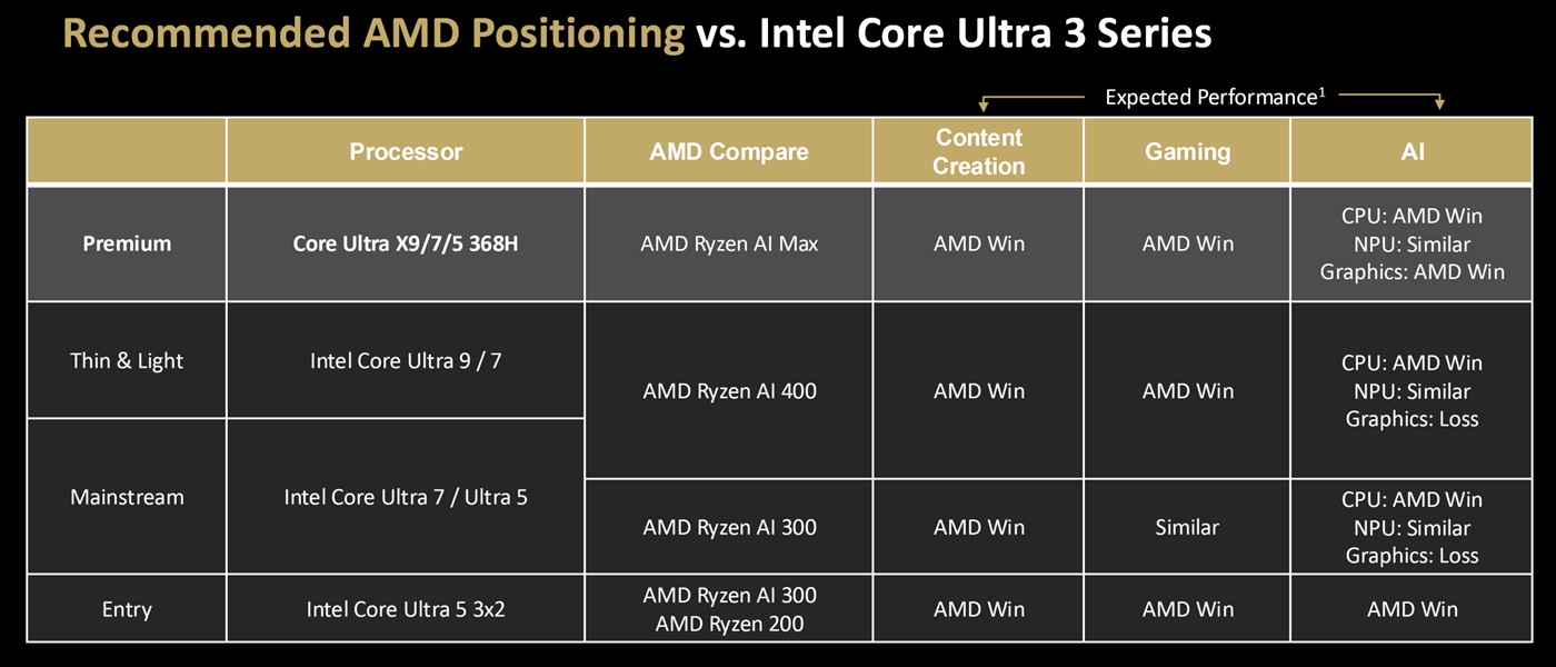 WCCF Tech thematisieren einen AMD-eigenen CPU-Vergleich mit Intel, bezogen auf das jeweilige 2026er Prozessoren-Angebot des Mobile-Segments. In jenem sieht sich AMD trotz einer neuen Intel-Generation in Form von "Panther Lake" durchgehend auf Augenhöhe oder sogar vorn – und zwar obwohl AMD hierbei primär mit Refresh-Modellen antritt. Dabei kam natürlich eine "kreative" Wahl der Vergleiche zum Einsatz, beispielsweise die X-Modelle von Panther Lake gegen Strix Halo – obwohl letztere in klar anderer TDP- und Performance-Klasse spielen. Dabei überrascht am ehesten, dass sich AMD überhaupt auf so etwas eingelassen hat – denn solcherart Präsentationsfolien kommen meist von demjenigen, welcher aktuell seine Felle wegschwimmen sieht (in der Vergangenheit bekannterweise zumeist Intel). Wirklich etwas zu gewinnen ist hiermit sowieso nicht, die Enthusiasten schütteln über so etwas den Kopf, am Massenmarkt geht dieser Hühnerkampf in aller Regel vollkommen vorbei. Dabei könnte man auch einfach nur die realen Tests dieser Hardware abwarten – bzw. sich die Hersteller mehr um deren zügige Auslieferung also solcherart Fehdehandschuhe kümmern.