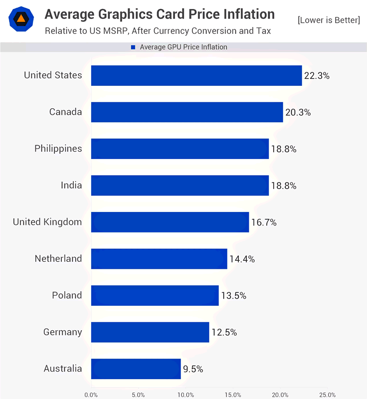 Jene schwachen Absatzzahlen scheinen somit einen sehr erheblichen, augenscheinlich bremsenden Einfluß auf die Grafikkarten-Preisentwicklung zu haben. Damit wird es nochmals mehr interessanter, was Jon Peddie Research Anfang Juni zum weltweiten Absatz an Grafikchips für Desktop-Grafikkarten zu sagen haben, da könnte durchaus eine Horrorzahl herauskommen. Nichtsdestotrotz gibt es derzeit schon eine gewisse Grafikartenpreis-Übertreibung im Zuge der Speicherkrise, welche allerdings je nach Markt beachtbar unterschiedlich ausfällt: In Deutschland sind es laut TechSpot derzeit gemittelt +12,5% oberhalb Listenpreisniveau, in Australien nur +9,5% und in den USA gleich +22,3% (gerechnet wurde hierbei gegenüber dem US-Listenpreis zum aktuellen Umtauschkurs und jeweiliger MwSt-Berücksichtigung). Dass die USA hierbei ganz oben stehen, dürfte sicherlich auch an der Einfuhrzoll-Situation liegen. Ansonsten liegen die regionalen Preisübertreibungen doch allesamt grob im selben Feld – auf ein letztlich weltweit ziemlich einheitliches Preisniveau hindeutend, welches somit primär von den Herstellern und weniger von der Handelskette oder/und regionalen Bedingungen bestimmt wird.