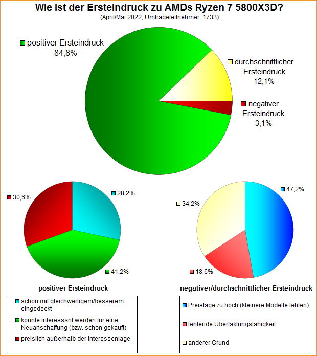 Mit einer Umfrage von Anfang Oktober wurde nach dem Ersteindruck zu Ryzen 7000 gefragt, gemäß der Ende des September in den Markt gegangenen neuen Prozessoren-Generation von AMD. Jene erzielte dabei mit 54,3 positiver Ersteindruck zu 37,1% durchschnittlicher Ersteindruck samt 8,6% negativer Ersteindruck ein gutklassiges Ergebnis. Selbiges ist jedoch weit entfernt von den größtenteils überragenden Ergebnisse der vorherigen Zen-Generationen: Zen 1 mit 74,6% positiver Ersteindruck, Zen+ mit 90,6%, Zen 2 mit 90,4% und Zen 3 mit ~89%. Andererseits ist nichts falsches an einem durchschnittlich guten Umfrage-Ergebnis, vor allem basierten die eher denn "kommunistisch" klingenden Umfrage-Ergebnisse der Vorgänger-Generationen zum nicht unerheblichen Teil sicherlich auch auf der fehlenden Intel-Konkurrenz zu jenen Jahren.