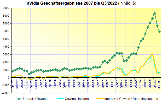 nVidia hat seine Geschäftsergebnisse für das grobe erste Jahresquartal 2023 vorgelegt, welches bei nVidia das erste Finanzquartal des Finanzjahres 2024 bilden und abweichend vom Kalender von Februar bis April verläuft. In diesem Zeitraum hat sich nVidia deutlich vom Negativtrend bei Intel und bei AMD entkoppelt können, zeigt und erwartet auch zukünftig wieder klar aufwärtsgehende Ergebnisse. Noch befindet sich nVidia allerdings in einem gewissen Umsatztal bzw. ist erst zur Hälfte aus diesem heraus: Damit sehen alle Ergebnisse gegenüber dem direkten Vorquartal glänzend aus (+19% Umsatz, +44% Gewinn, +37% non-GAAP operativ), gegenüber dem Vorjahreszeitraum gibt es aber immer noch zumeist Minuszahlen (–13% Umsatz, +26% Gewinn, –23% non-GAAP operativ).