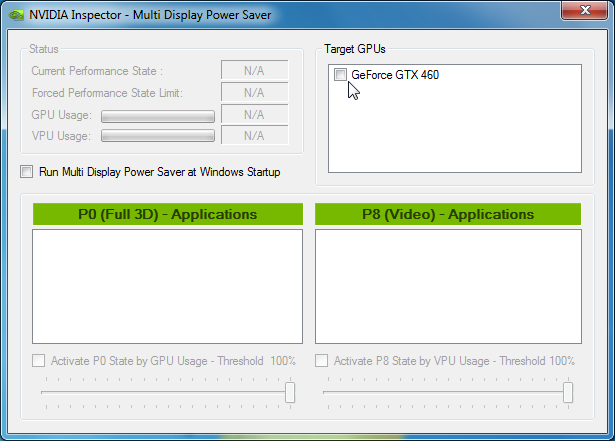[29]Abgesehen von konkret definierten Ausnahmen für einzelne Anwendungen, denen der zugeordnete, maximale Performance State jederzeit zur Verfügung steht, erlaubt der Multi Monitor Power Saver auch noch eine dynamische, lastabhängige Herangehensweise. Unabhängig voneinander lassen sich Schwellenwerte für die GPU-Auslastung sowie die VPU-Auslastung vorgeben – und wird eine definierte Schwelle überschritten, so gibt der NVIDIA Inspector den Performance State P0 für GPU-Berechnungen beziehungsweise Performance State P8 für Videobeschleunigung automatisch frei.