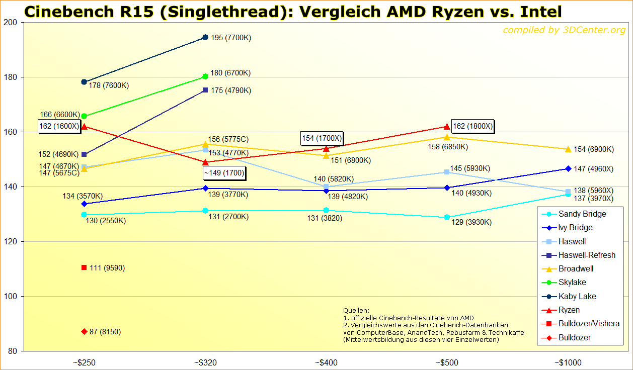 Cinebench R15 Singlethread: Vergleich AMD Ryzen vs. Intel