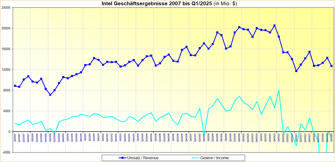 Intel Geschäftsergebnisse 2007 bis Q1/2025