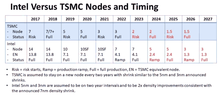 Intel vs. TSMC Nodes & Timing (by IC Knowledge)