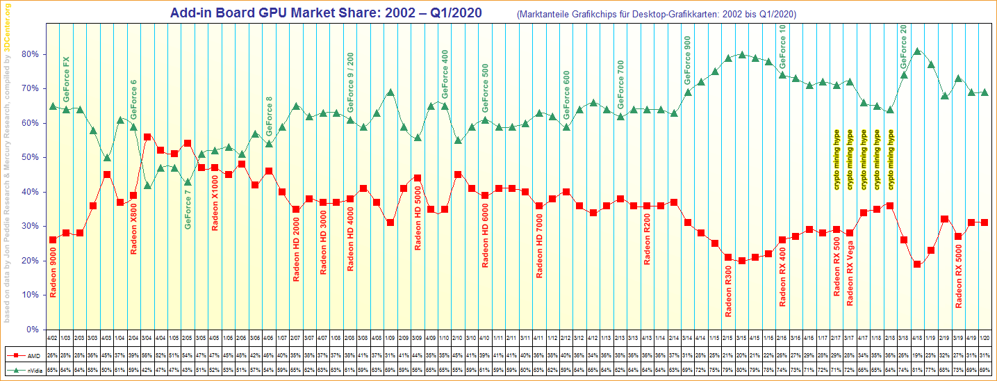 Marktanteile Grafikchips für Desktop-Grafikkarten von 2002 bis Q1/2020
