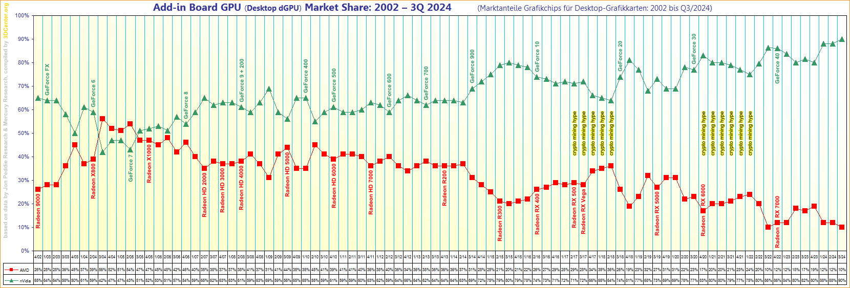 Marktanteile Grafikchips für Desktop-Grafikkarten von 2002 bis Q3/2024