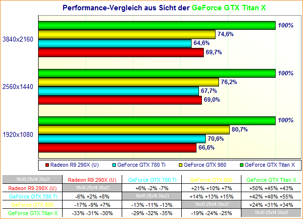 Performance-Vergleich aus Sicht der GeForce GTX Titan X (mit allen Werten)