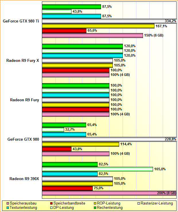 Rohleistungs-Vergleich Radeon R9 390X, Fury Fury X, GeForce GTX 980 & 980 Ti