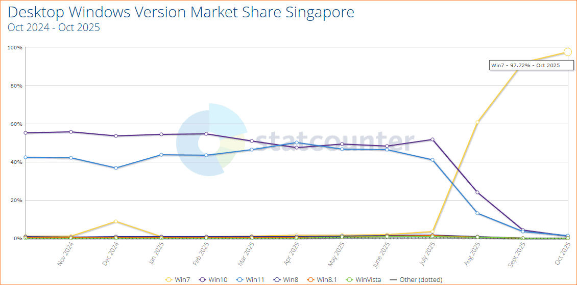 Statcounter Windows-Verbreitung in Singapur Oktober 2024 - Oktober 2025 (vorläufige Werte)