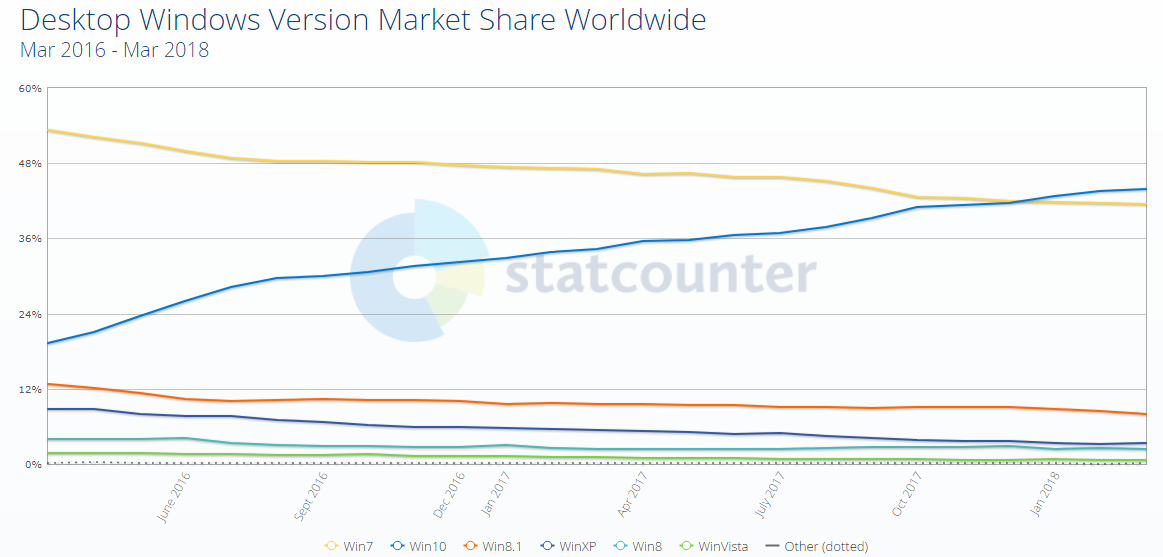 Weltweite Betriebssystem-Verteilung (PC) von März 2016 bis März 2018 (lt. StatCounter, nur Windows)