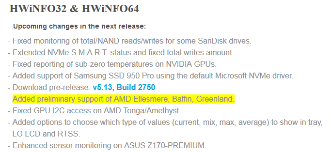zukünftiger HWiNFO-Support der AMD-Grafikchips Ellesmere, Baffin und Greenland